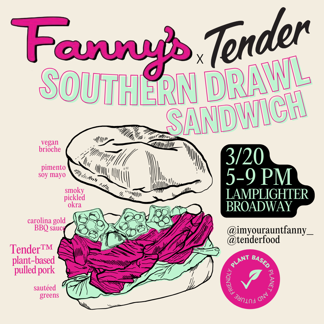 Graphic design and illustration for a pop-up co-hosted by plant-based meat startup Tender Food, 2023.
