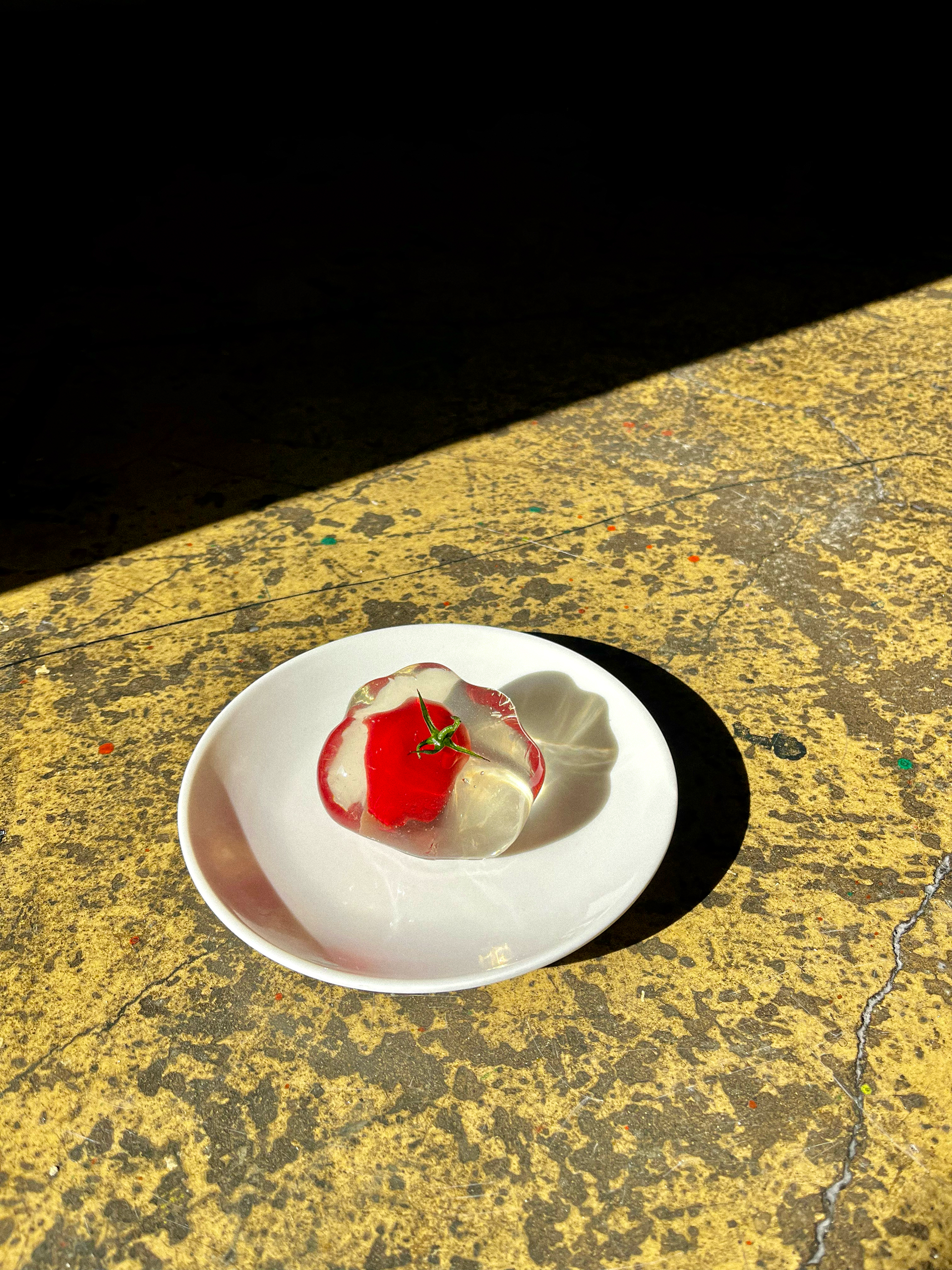 This is Nudake SEOUL’s Tomato 1, an agar-based lime jelly encasing a chocolate shell of strawberry and tomato pulp, with cilantro. Shot on Canon Rebel SL3.