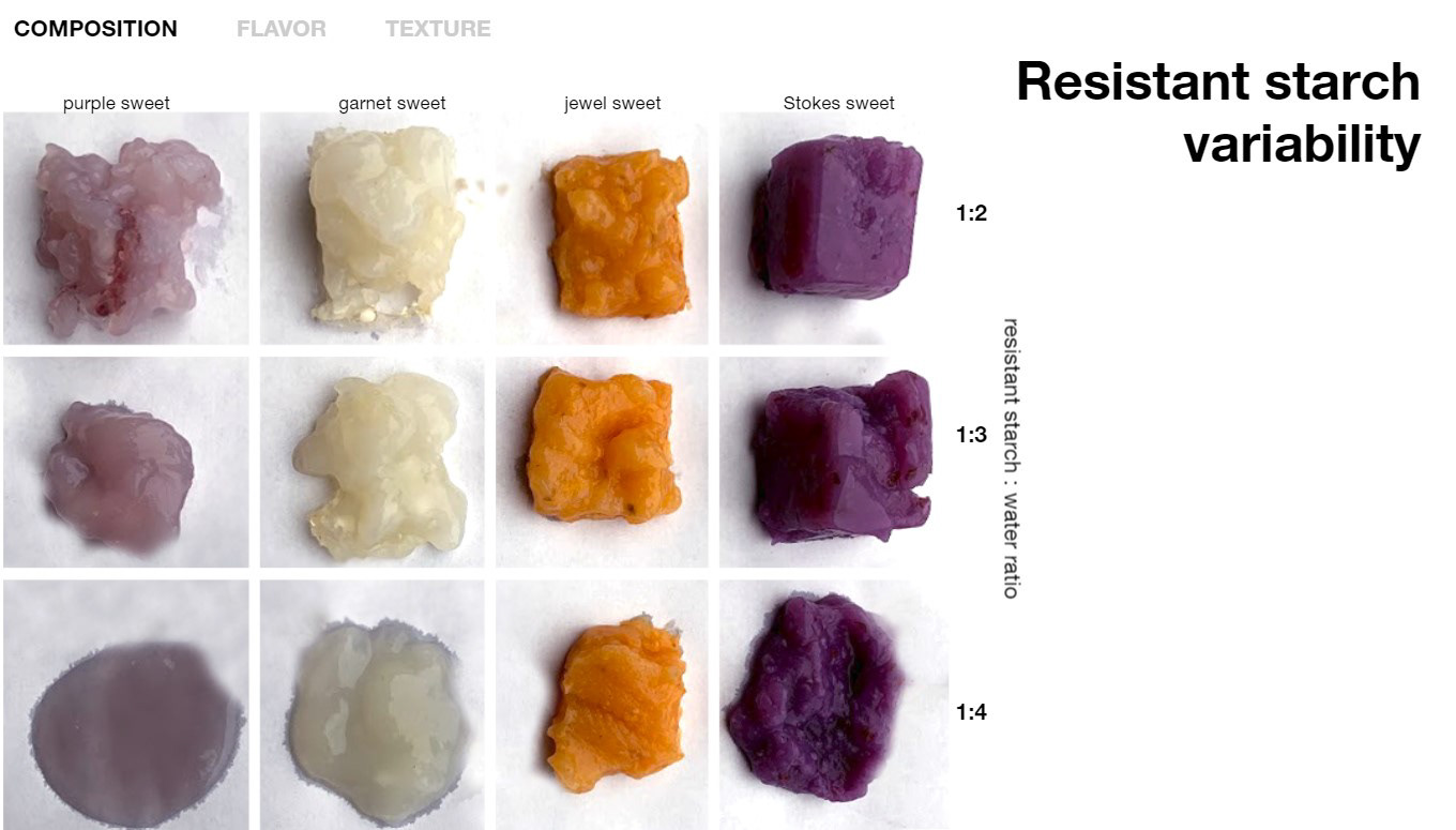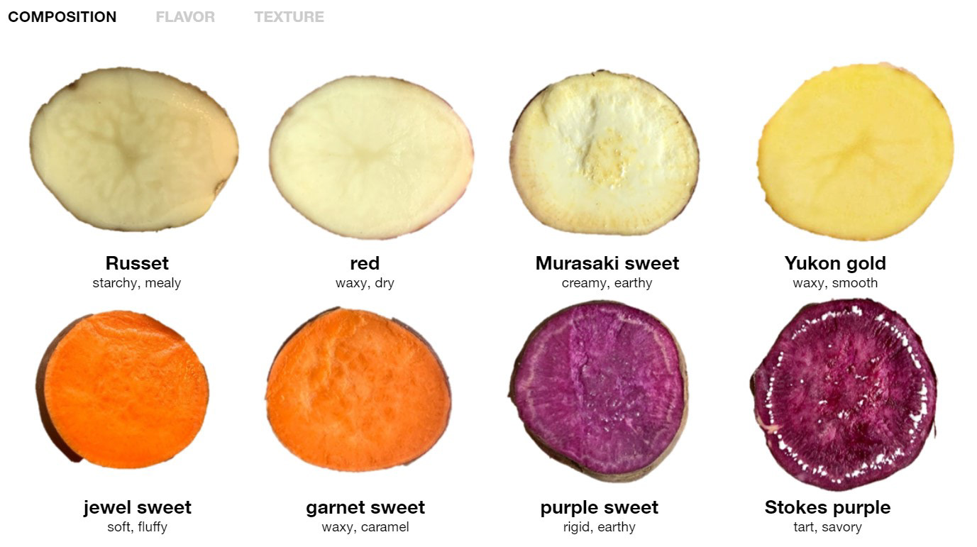 [Red, Russet, Murasaki, Yukon gold, Jewel sweet, Garnet sweet, and Stokes purple sweet potatoes, fried and starch-extracted in Carolien Niebling’s Advanced Food Product Design Studio, 4.041, Spring 2021.]